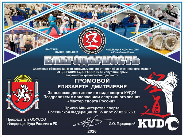 Поздравляем Громову Елизавету с днём рождения, и с присвоением Мастера спорта России!4 апреля свой День рождение отмечает мастер спорта России по КУДО Громова Елизавета Дмитриевна, неоднократная победительница Крымских турниров , трехкратная победительница Всероссийских соревнований К2 г.Москва 2023г., 2024г., 2025г. Победительница Всероссийских соревнований «Новые имена» г.Минеральные Воды 2024г. Победительница Всероссийских соревнований ГРУ г.Москва 2025г. Победительница Всероссийских соревнований «Grizzly Open Cup X», г.Ярославль 2026г. Чемпионка России 2026 года в категории 215с.е. Занимается КУДО в городе Ялта в спортивном клубе «Дмитрий Донской», под руководством сестры Громовой Анастасии Дмитриевны. Поздравляем нашу красавицу Елизавету с днём рождения и с присвоением спортивного звания «Мастер спорта России» (Приказ Министерства спорта Российской Федерации № 35 нг от 27.02.2026 г.)! Спорт — это путь, на котором нет конечной точки для самосовершенствования. Желаем крепкого здоровья, множества триумфов и высших наград. Пусть жизненный путь будет гладким, а бытовые разногласия обходят стороной. Пусть каждый день напоминает добрую сказку и открывает новые горизонты. Устанавливай новые планки, служи примером для окружающих и вдохновляй их на великие дела. Желаем тебе славных побед, личного счастья и исполнения самых заветных желаний. Дружная команда КУДО Республики Крым и Города-Героя Севастополя!!!